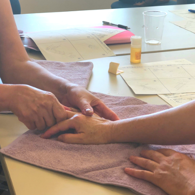 アロマテラピーでは精油を植物油などの基材で希釈して、トリートメントオイルを作成し、肌に塗布する方法トリートメント法と呼んでいます。ハンドトリートメントは、香りとタッチングの両方の心地よさを感じていただけるレッスンです。またご自身で体のメンテナンスができること、お好きな香りで楽しんでいただけることも、アロマハンドトリートメントの強みです。