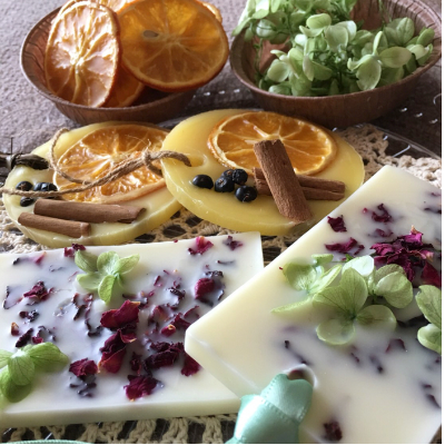 ハーブやドライフルーツを使ったアロマワックスサシェは、目でも楽しんでいただけるアイテムです。「火を点さないキャンドル」として注目されています。