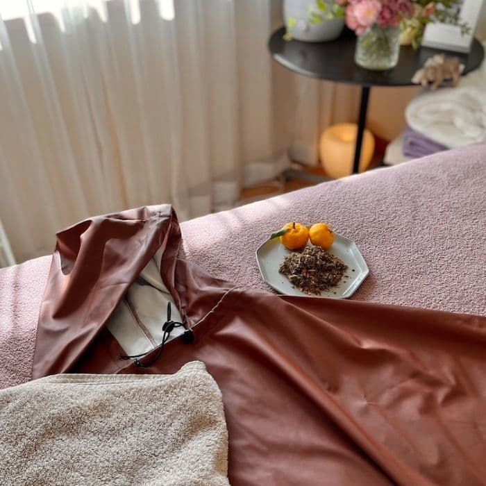 ハーバルスチームの後の汗はとてもサラサラで、拭き取るだけで心地よくベタつきもありません。
